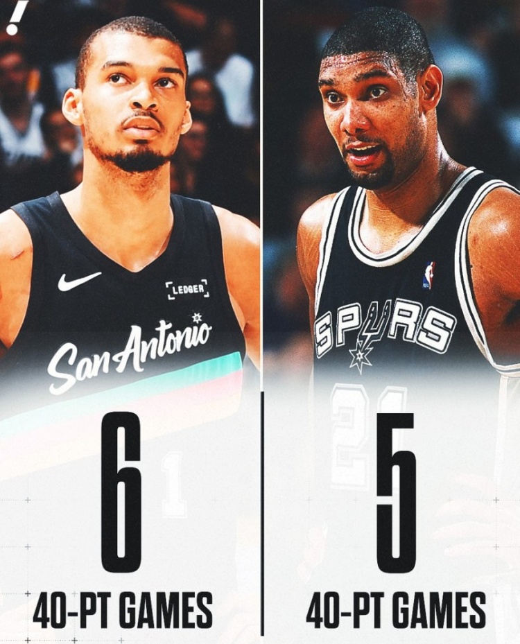 目前,文班亚马已经得到了40分,这是他马刺生涯第6次40+,超越邓肯的5次。