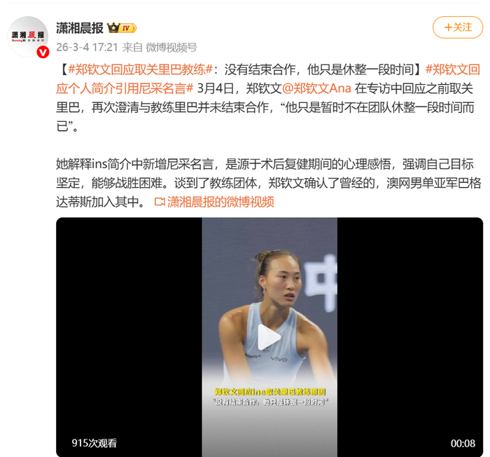 此外,关于郑钦文取关功勋教练佩雷里巴一事,中国一姐也在印第安维尔斯首次开口,进行了正面回应。